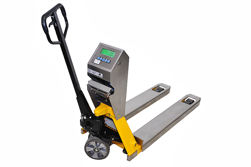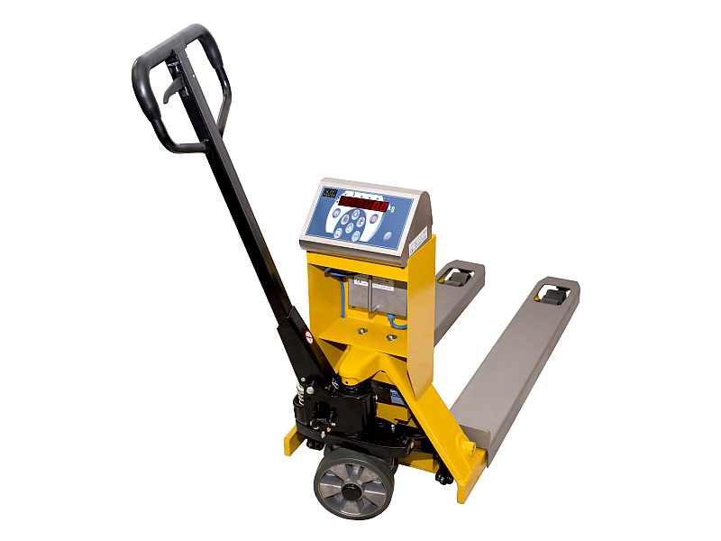 Stabile und sehr robuste, industriegerechte Waagenkonstruktion, Stahl pulverbeschichtet ähnlich RAL 1003, mit Edelstahl Übergabeln Glasperlgestrahlte griffige und matte Oberfläche. Lenkräder Gummi, Tandem-Lastrollen Polyurethan Anti-Statisch.