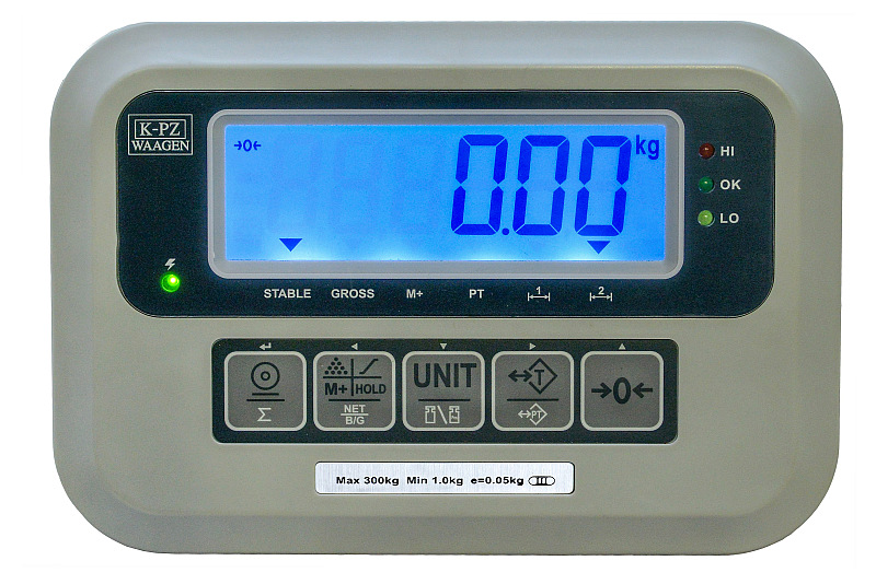 Große bedienerfreundliche, staub- und wasserdichte Folientastatur, 4 große Bedientasten. LCD - Anzeige, 6 stellig, 28 mm hohe Ziffern, hinterleuchtet. Auch für eichpflichtige Anwendungen.