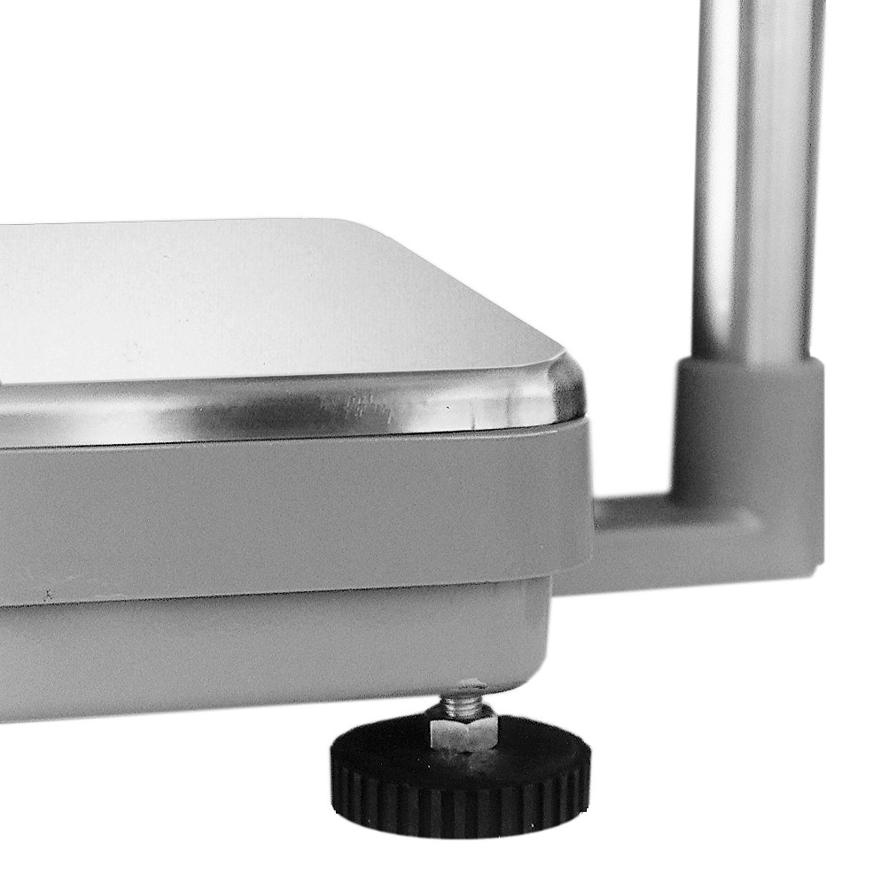 Höhenverstellbar und rutschfest gummierter Fuß für einen sicheren Stand. Nivellier-Libelle zum Ausrichten der Plattformwaage.